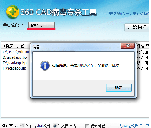 3先关闭所有正在使用的CAD(包括天正等二次开发的CAD),使用360CAD病毒专杀工具全盘扫描。